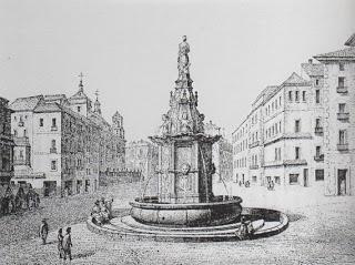 Nos habla D. Ramón de Mesonero Romanos en “El Antiguo Madrid, paseos histórico-anecdóticos por las calles y casas de esta villa” de 1861, que antes de la fuente de Pedro Rivera , hubo otra también de estilo recargado, frente a la Iglesia del Buen Suceso de la que os mandé una foto el 4 de febrero (de la iglesia, que la fuente ya no estaba), tanto la primera como la segunda fuente estaban coronadas por una estatua de Venus, a la que se la conocía como Mariblanca. Cuando Ramón escribía el libro, la estatua ya no estaba en Sol, sino en la plaza de las Descalzas.