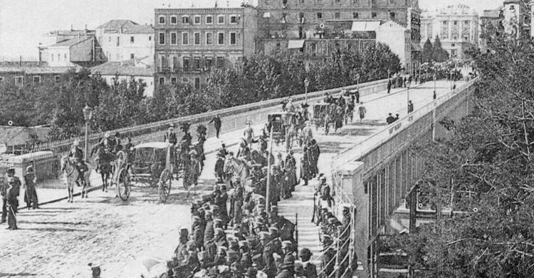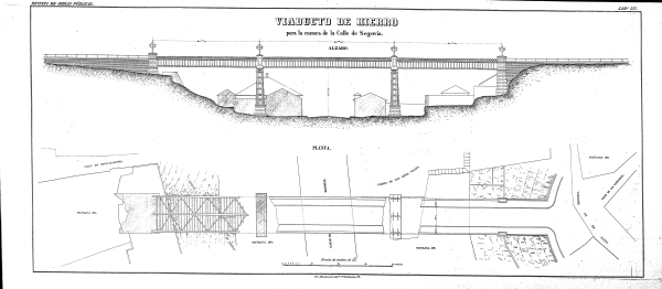 Salvar ese desnivel y evitar tener que utilizar las costanillas de uno y otro lado, mediante la construcción de un viaducto es algo que ya se planteó en tiempos de Felipe V, y existió un proyecto de 1736 del arquitecto Juan Bautista Sachetti que no se llevó a cabo. En tiempos de José Bonaparte se realiza otro proyecto de Silvestre Pérez, pero no hay pasta para realizarlo, pero el XIX es un siglo con muchos cambios, y entre ellos está modernizar la ciudad construyendo nuevas calles más racionales (cuadriculadas vamos), y para ello se derriban bastantes edificios entre ellos la Iglesia de Santa María de la Almudena, la más antigua del Foro, y el 31 de enero de 1873 se inicia la construcción del primer viaducto, que une por la calle de Bailén el Palacio Real y la Basílica de San Francisco el Grande. De hierro y madera era una obra prodigiosa, 23 metros de altura máxima sobre la calle Segovia, 120 metros de largo con su tablero de 13 metros de ancho capaz de aguantar 400 Kg. por metro cuadrado, pero eso no era suficiente para el tráfico que llegó a tener, por lo que se derribó en 1932 para construir otro diseñado por Francisco Javier Ferrero Llusiá, de hormigón armado sobre machones de granito que se terminó en 1934 y la guerra que vino después casi termina con él por lo que tuvo que ser restaurando.