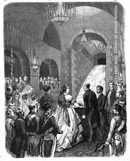 A las seis y media de la tarde los alabarderos se encontraban formados en el jardín construido sobre el depósito, para recibir, junto con los ministros, autoridades, directivos del Canal y representantes del Ayuntamiento, a la reina Isabel II, su esposo D. Francisco de Asís y el príncipe de Asturias D. Alfonso, que bajando por la escalera de caracol abierta en la bóveda del depósito pudieron contemplar el espectáculo que ofrece el agua procedente del Lozoya al precipitarse sobre el depósito iluminado para ocasión con farolillos de colores. Se visitaron tanto el del Oeste como el del Este, situados en lo que había sido el campo de Guardias, y de donde ya hemos dado cuenta de alguna ejecución (7 de febrero -1852- ejecución del cura Merino https://madriztaldiacomohoy.org/2019/02/07/7-de-febrero-2/ ), y fueron bendecidos por el arzobispo de Toledo. Terminado el acto de inauguración de los depósitos, la comitiva vuelve a Madriz (sí, aquello entonces era extrarradio) hasta la Calle Ancha de San Bernardo donde a las ocho y media de la tarde se inaugura una gran fuente, en realidad un gran surtidor que elevaba el chorro de agua a casi cien pies de altura (más de 30 metros) más que cualquiera de los edificios de alrededor, iluminado con la luz eléctrica instalada en la puerta de Fuencarral, el ministro de la Gobernación , José Posada Herrera dijo a la reina: _”Señora, hemos tenido la suerte de ver un río ponerse en pie”_.