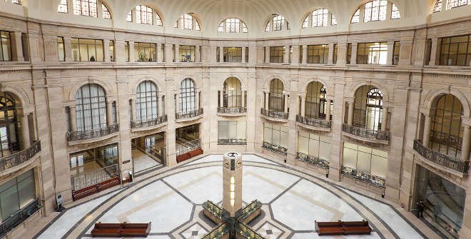 Obra de los arquitectos Eduardo Adaro y Severiano Sainz de la Lastra, las obras finalizaron en 1891, entonces sería la viuda de Alfonso XII y su hijo quien inauguró el edificio terminado, bueno, terminado como lo conocemos ahora no, en 1927 se acordó una importante ampliación, que incluía un amplio patio de operaciones de 900 m², 27 metros sobre él una vidriera suspendida lo ilumina, al más puro estilo Art Deco, y se dotó le de su inmensa (2,500 m²) cámara acorazada obra encargada al arquitecto José Yamoz Larrasa, su hijo quien se encargó de otra ampliación entre 1969 y 1975. finalmente el cerramiento de la manzana se ejecutó entre 2003 y 2006 según proyecto de Rafael Moneo.