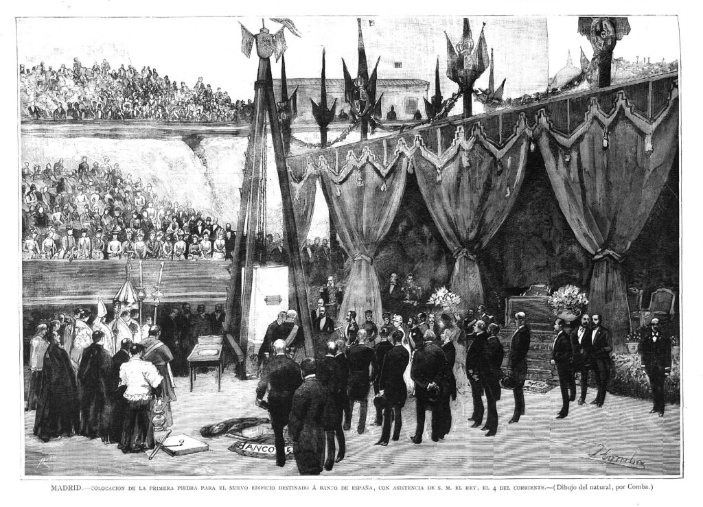 “A la caida de la tarde de ayer se celebró la ceremonia de colocar la primera piedra del suntuoso edificio destinado á Banco de España, que se ha de erigir en el solar que ocupaba el antiguo palacio del duque de Sexto.