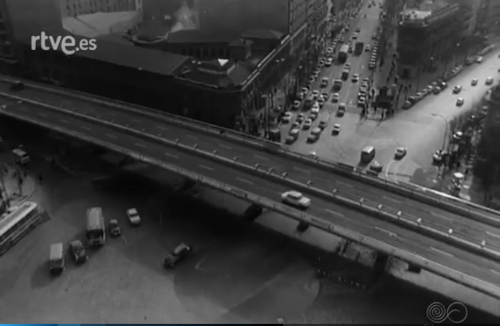 Las Rondas son la vía para desplazarse desde Moncloa hacia el este y luego hacia el sur, por Bravo Murillo y Santa Engracia los desplazamientos desde la entrada por el norte (Plaza Castilla) hacia el centro de la ciudad. Cuatroca además es el punto donde tienen cabecera los transportes públicos, ya lo tuvo el tranvía a Sol, y el primer tramo de metro. Recuerdo que mi madre decía “coges el 49 y te deja en el centro” (Cuatro Caminos era ya el centro para la peña del Barrio la Pili). Así la Glorieta se convierte en un atasco continuo, hay que buscar una solución, y por ello siendo alcalde Carlos Arias Navarro, tal día como hoy de 1969 se inaugura el scalextric de Cuatro Caminos, mira que cambio: