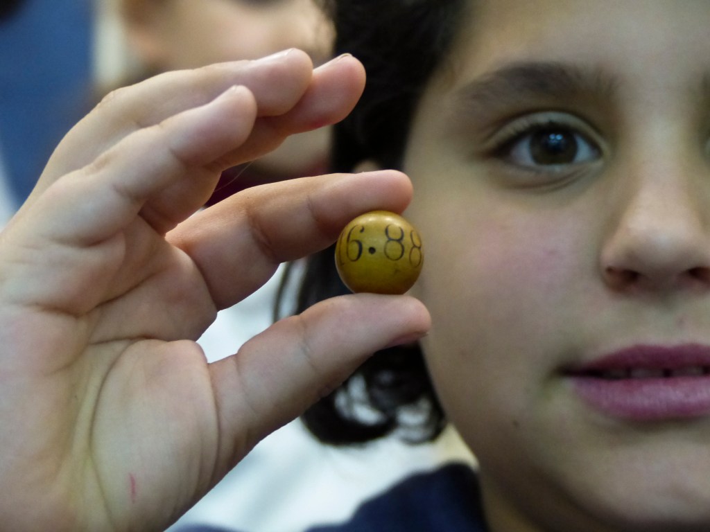 Así que ya tenemos por un lado a unos niños que cantan, y por otro un sorteo que necesita de manos inocentes para extraer las bolitas.