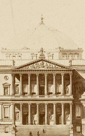 En 1835 se desamortiza el convento de Copacabana, de los agustinos recoletos, y en ese terreno se plantea, años más tarde crear un edificio para albergar la Biblioteca Nacional y los Museos.