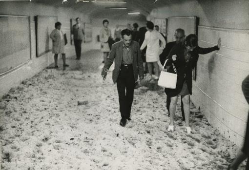 Hasta el 40 de mayo, no te quites el sayo, porque hace calor, días de mucho calor incluso, pero no te puedes fiar, cuando menos te lo esperas, el barómetro se desploma y empieza a caer agua, o lo que es peor granizo. Eso fue lo que pasó tal día como hoy de 1971 en Madriz, sobre las tres de la tarde caía especialmente sobre el eje de la Castellana, en solo media hora más de ocho litros por metro cuadrado. En la estación de metro de Atocha llegó hasta los pasillos, como podéis ver en la foto de ABC que os acompaño. Según el diario Madrid, a dos poceros les pilló currando en el colector de Paseo de Pontones con el de Imperial, el cuerpo de Ángel Vidal se encontró en el Manzanares, el de su compañeros estaba desaparecido.