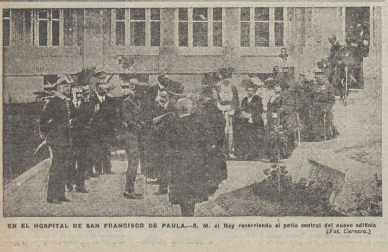 “A las seis y cuarto llegó Su Majestad al Hospital de San Francisco de Paula, acompañado del marques de la Torrecilla, del conde de Aybar y del general Aranda. Vestía el Rey uniforme de verano de general y llevaba las insignias del Toisón y la venera de las órdenes militares. Después de presentar el presidente del Consejo a Su Majestad a la fundadora del hospital, el Rey y los infantes, con su séquito oficial, entraron en la iglesia, donde la Capilla Isidoriana cantó la «Sal-ve” de Pedrell.
