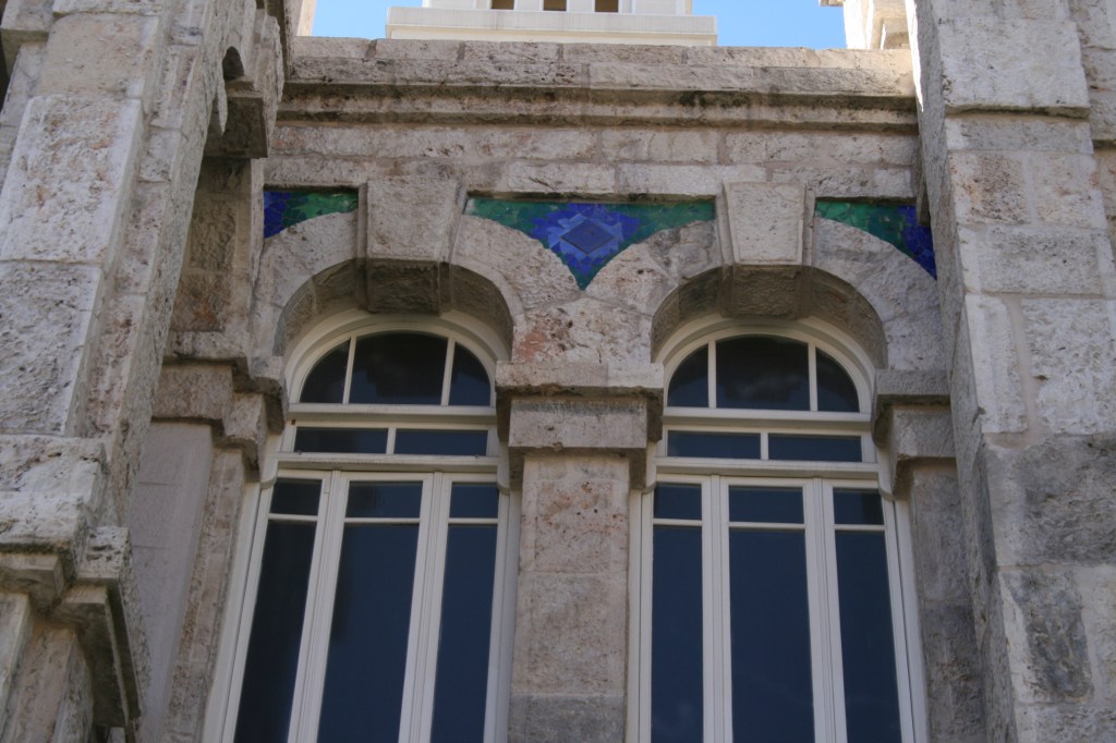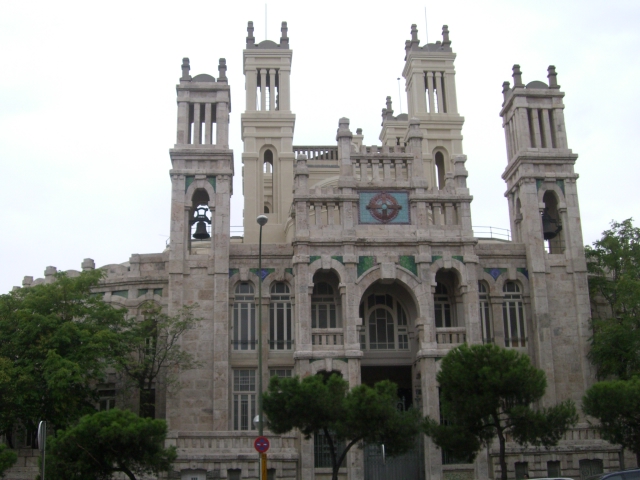 En esos planos, de 1900 y 1910, vemos el hipódromo, y el tercer depósito, de los que ya hemos hablado, y entre los dos, donde se juntan ambos mapas, el Hospital de Maudes, el Hospital de Jornaleros de San Francisco de Paula, que nos puede parecer un castillo (a mí me lo parecía de niño), y que si nos fijamos nos recuerda a Nuestra Señora de Comunicaciones, claro, es Obra de Antonio Palacios (uno de nuestros arquitectos favoritos), quien se metió a diseñar un hospital, compaginando la obra con la del Palacio de Comunicaciones, con el que coincide en algunas cosas, incluido proveedores, pero para el hospital siempre tuvo presente, después de la funcionalidad (uso del modelo panóptico, el de las cárceles modelo, optimización de la ventilación para evitar en lo posible contagios de unos pabellones a otros, etc.), la economía, esa piedra caliza está sin desbastar, solo almohadillada, en la decoración de azulejos de las enjutas, que con sus brillos dan movilidad a las fachadas, se utiliza en muchos la técnica de tencadiç, (que usaría Gaudí mucho), es decir hacer un mosaico con azulejos rotos, y la guita no llegó para poner en todas las enjutas. El edificio es de una gran belleza, impresionante, un edificio de Palacios.