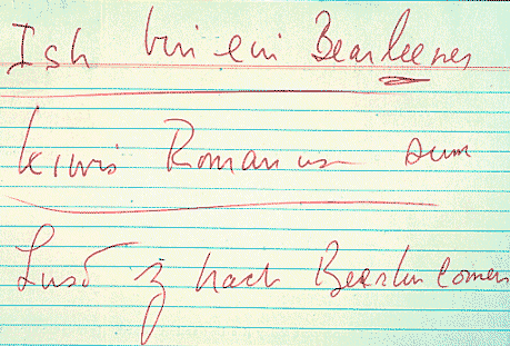 «Hace dos mil años, no existía mayor orgullo que decir «Civis Romanus sum» («soy un ciudadano romano»). Hoy, en el mundo de la libertad, no hay mayor orgullo que poder decir «Ich bin ein Berliner!!» (¡¡Soy berlinés!!).»