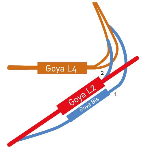 Así no era necesario hacer trasbordo (como en el caso del tramo Opera-Norte), pero inevitablemente se producía un cruce de trenes, para hacerlo a distinto nivel se construyó un nuevo andén, el anden Goya bis, al que se accede desde una pequeña puerta que hay en el anden de Goya dirección Cuatroca, (alguno cuando vaya al Colegio que se fije), pero no podréis acceder, los de Metro parece que había perdido la llave de esa puerta y ese andén nunca era pisado por humanos, sien embargo abajo os dejo una sorpresa, aún así, viajando en la línea 4, antes de llegar a Goya desde Lista, hay una curva que se hace a 30 Km/h, pues si os fijáis a la izquierda hay un túnel que es el que lleva a Goya bis, y que hasta 1958 daba servicio a la bifurcación de la línea 2. Os pongo como reto, cazar una foto de ese túnel.