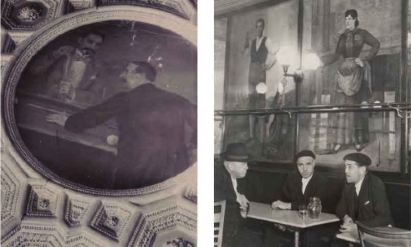 En el artesonado del techo, encuadrados en unos adornos de escayola que les sirven de marco, hay seis lienzos pintados hace bastantes años, que han tomado un color amarillento y noble. Uno de los lienzos representa a un señor de barba negra y con chistera, bajo la cual se adivina una calva zapatera como la de San José de Calasanz; éste lee un periódico, con un abrigo de color buey: tiene tipo de director de orquesta; el mármol de la mesa está ocupado con un gran vaso de café, como se servía antes, y la botella de agua y un platillo lleno de enormes terrones de azúcar de pilón; hay un tintero, y acaba de escribir una carta para conquistar a una viuda de dinero. El camarero, un hombre cuadrado, con patillas y pechera muy limpia, con tipo de marqués, le sirve el café muy atento y servicial.