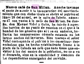 El edificio de viviendas que ocupó lo que había sido la iglesia, San Millán n.º 5, dejó su planta baja y principal (hoy Norby Fajas, moda de baño y corsetería) unidos por una escalera de caracol, local en el que tal día como hoy de 1876 se abrió el “Nuevo Café de San Millán” con mesas de mármol, silla y divanes de tela roja, paredes recubiertas de espejos, y en la planta superior salones y billar.