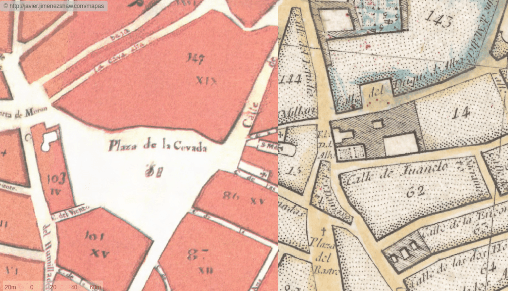 De la plaza de Cascorro (https://madriztaldiacomohoy.org/2019/06/05/5-de-junio/) salimos por la calle de San Millán y llegamos a lo que fue una plaza, claro que lo que llamamos la plaza de Cascorro seguía siendo la calle del Estudio, y la de San Millán era de los Cojos.
